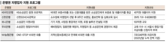 우리은행은 소상공인 창업아카데미를 통해 예비창업자, 업종전환 희망자, 자영업자 등 소상공인에 경영지식을 제공한다. 교육을 이수할 경우 서울시 창업기업자금대출의 신청자격이 부여된다. 하나은행은 총 100억원 규모의 소상공인 지원사업을 실시했다. △기기 지원(고효율 에너지 및 디지털 전환 기기) △사업장 환경개선 지원(간판 및 실내보수) △토탈 솔루션 컨설팅 지원 등 총 3가지 프로그램으로 실시된다.