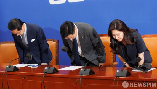 [서울=뉴스핌] 윤창빈 기자 = 박찬대 더불어민주당 원내대표(가운데) 등 소속 의원들이 19일 오후 서울 여의도 국회에서 열린 국회 원 구성 관련 언론브리핑에서 인사하고 있다. 2024.06.19 pangbin@newspim.com