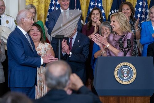 조 바이든 미국 대통령과 부인 질 바이든 여사가 18일(현지시간) 백악관에서 열린 미등록 청소년 추방유예(DACA) 시행 12주년 기념 행사에 참석하고 있다. EPA연합뉴스 |