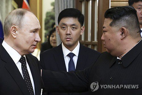 (모스크바=연합뉴스) 최인영 특파원 = 김정은 북한 국무위원장과 블라디미르 푸틴 러시아 대통령이 19일 '포괄적 전략 동반자 협정'을 체결, 관계 격상을 전격 선언한 가운데 북러간 밀착이 교차 방문을 통한 양국 정상간 핫라인 가동 정례화로 이어질지 주목된다.