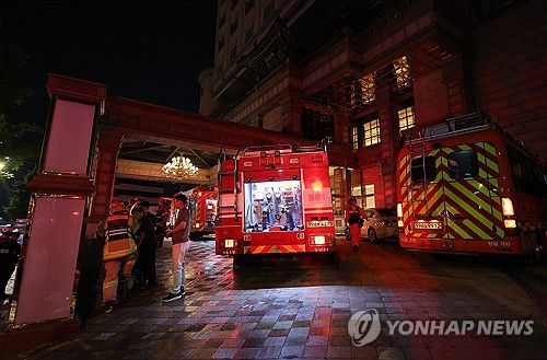 논현동 한 호텔에서 화재…현장 통제하는 소방대원들 |