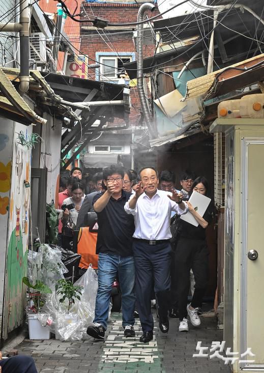 추경호(오른쪽) 국민의힘 원내대표가 20일 오후 서울 영등포구 쪽방촌을 방문해 여름철 재난안전대비 현장점검을 하고 있다.