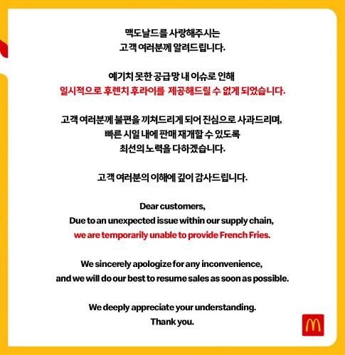 아시아투데이 이수일 기자 = 한국맥도날드가 공급망 문제로 국내에서 감자튀김(후렌치 후라이) 판매를 일시 중단했다.