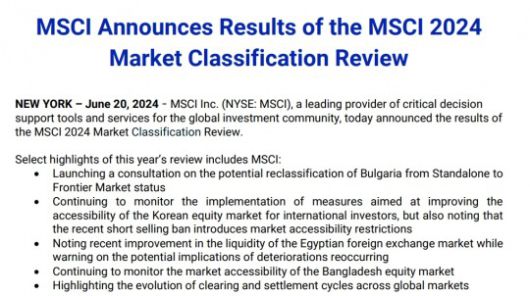 MSCI는 20일(현지시간) 공개한 '2024년 연례 시장 분류 결과(Results of the MSCI 2024 Market Classification Review)'에서 이 같이 발표했다.