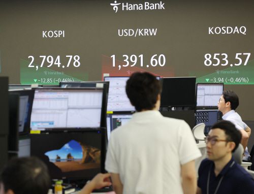 21일 오전 서울 중구 하나은행 딜링룸에서 직원들이 업무를 보고 있다./연합 |