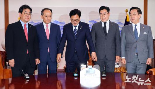 우원식 국회의장이 21일 오후 서울 여의도 국회 의장실에서 원 구성을 위한 양당 원내대표 회동에서 기념촬영을 하고 있다. 왼쪽부터 국민의힘 배준영 원내수석부대표·추경호 원내대표, 우원식 의장, 더불어민주당 박찬대 원내대표·박성준 원내수석부대표.
