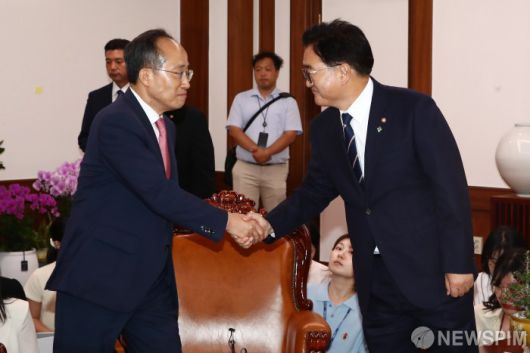 [서울=뉴스핌] 이형석 기자 = 우원식 국회의장(오른쪽)과 추경호 국민의힘 원내대표가 21일 오후 서울 여의도 국회 의장실에서 가진 원 구성 관련 회동에서 악수하고 있다. 2024.06.21 leehs@newspim.com