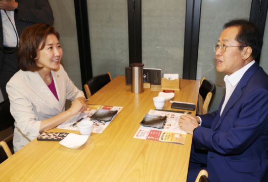 국민의힘 차기 대표 선거 출마를 예고한 나경원(왼쪽) 의원이 21일 대구 동구 신세계백화점 내 일식집에서 홍준표 대구시장과 대화하고 있다. 2024.6.21 연합뉴스 |