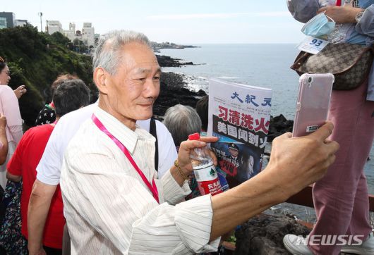 [제주=뉴시스] 우장호 기자 = 중국인 단체관광객(유커·遊客)들이 31일 오후 제주 시내권 대표적인 관광지인 용두암을 찾아 기념촬영을 하며 즐거운 시간을 보내고 있다. 2017년 '한한령(한류제한령)' 이후 6년5개월 만에 크루즈선 '블루드림스타호(Blue Dream Star·2만4782t)를 타고 온 이들은 8시간 가량 제주에 머문 후 일본으로 향한다. 2023.08.31. woo1223@newsis.com |