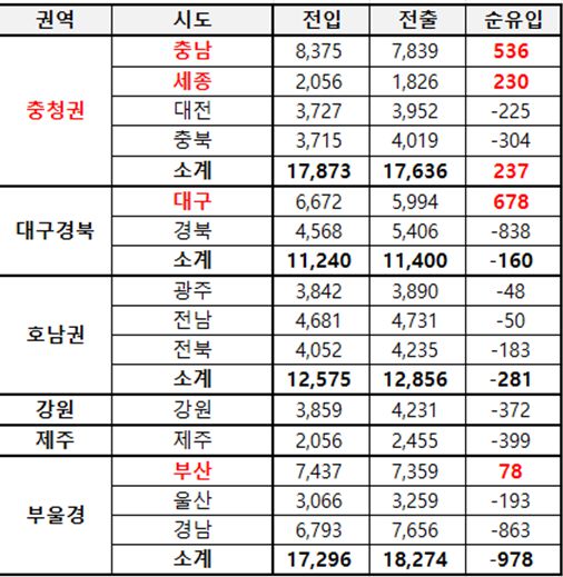 충청권 지역별 순유입 인원은 충남 아산시 695명, 대전 유성구 341명 세종시 230명 등이다. 반면 서울은 전출 1만9653명, 전입 1만8914명으로 739명이 순유출됐다.