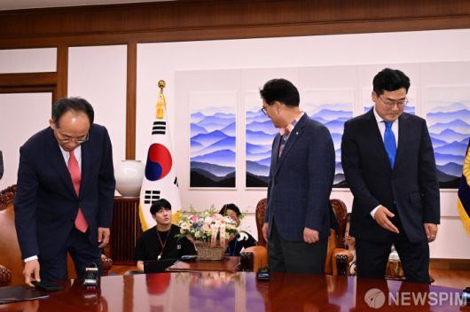 [서울=뉴스핌] 윤창빈 기자 = 우원식 국회의장이 23일 오후 서울 여의도 국회에서 추경호 국민의힘 원내대표, 박찬대 더불어민주당 원내대표와 국회 원 구성과 관련해 회동을 하고 있다. 2024.06.23 pangbin@newspim.com