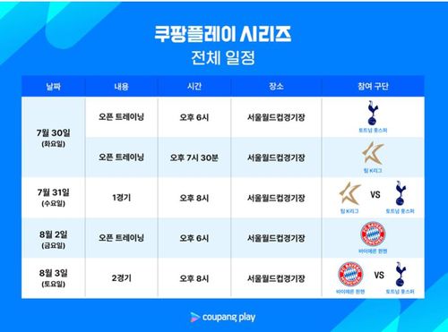(서울=연합뉴스) 이영호 기자 = '2024 쿠팡플레이 시리즈'에 참가하는 토트넘 홋스퍼(잉글랜드), 바이에른 뮌헨(독일), 팀 K리그의 오픈 트레이닝 일정이 공개됐다.