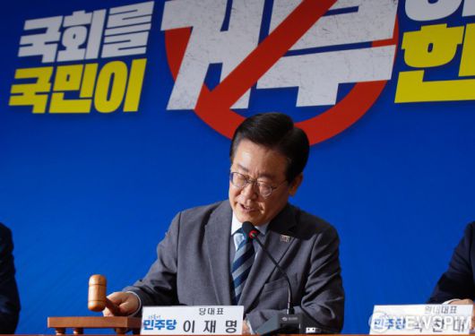 [서울=뉴스핌] 윤창빈 기자 = 이재명 더불어민주당 대표가 24일 오전 서울 여의도 국회에서 열린 최고위원회의에서 의사봉을 두드리고 있다. 2024.06.24 pangbin@newspim.com |
