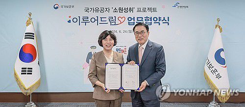 (서울=연합뉴스) 강정애 국가보훈부 장관이 24일 서울 용산구 서울지방보훈청에서 조용병 은행연합회장과 국가유공자 소원 들어주기 이루어드림 업무협약을 체결 후 기념 촬영하고 있다. 2024.6.24 [국가보훈부 제공. 재판매 및 DB 금지]