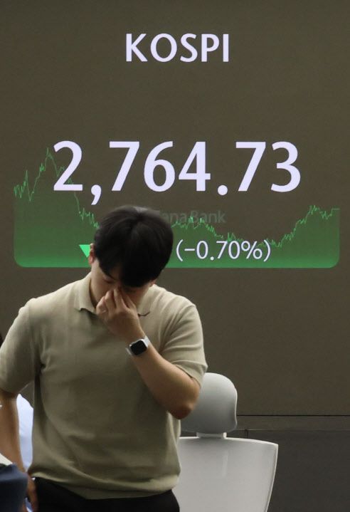 24일 코스피는 전거래일보다 19.53포인트(0.7%) 내린 2764.73으로 장을 마쳤다. 코스닥은 11.15포인트(1.31%) 내린 841.52에, 원/달러 환율은 0.7원 오른 1389.0원에 마감했다. 사진은 이날 서울 중구 하나은행 본점 딜링룸 모습. (사진=연합뉴스) |