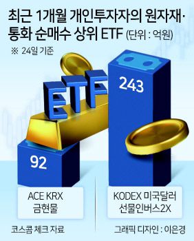 25일 코스콤 체크에 따르면, 최근 1개월 동안 개인들이 통화와 원자재 ETF에서 가장 많이 산 상품은 달러값 하락에 2배로 배팅하는 곱버스 ETF인 ‘KODEX미국달러선물인버스2X(순매수 243억원)’와 국내 유일 금 현물 ETF인 ‘ACE KRX금현물(92억원)’였다. 이 기간 두 상품의 수익률은 각각 -3.65%, -1.48%를 기록했다. 앞으로 강 달러는 꺾이고 금값은 오른다는 데에 베팅한 것이다.