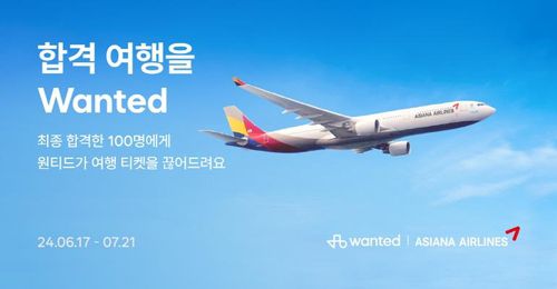 ▲ HR테크 기업 원티드랩[376980]은 이직 준비 직장인과 취업준비생을 응원하기 위해 아시아나항공[020560]과 '합격 여행을 원티드' 이벤트를 진행한다. 여름 동안 이직에 성공한 원티드 회원 중 100명을 추첨해 일본 나고야, 센다이, 홍콩, 베트남 호찌민 등의 왕복 항공권을 랜덤으로 제공한다. 원티드를 통해 채용 공고 지원을 마친 뒤 다음 달 21일까지 원티드랩 홈페이지 이벤트 탭에서 신청하면 된다. 같은 기간 휴가나 워케이션을 떠나는 직장인을 위해 원티드 포인트 500포인트를 항공권 최대 10% 할인이나 유료좌석 15% 할인 쿠폰으로 교환해주는 '직장인 방학을 원티드' 이벤트도 열린다. (서울=연합뉴스)