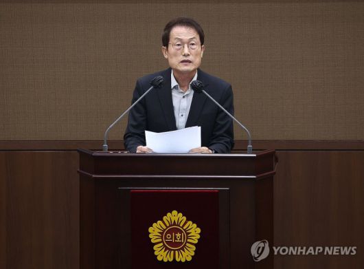 조희연 서울시교육감이 25일 오후 서울특별시의회에서 열린 제324회 서울시의회 정례회 본회의에서 '서울특별시 학생인권 조례 폐지조례안 재의의 건'과 관련해 발언하고 있다. 연합뉴스 |