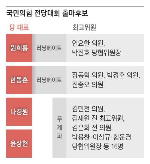 한동훈 후보의 최고위원 러닝메이트는 장동혁(재선)·박정훈(초선) 의원이다. 한 후보의 청년 최고위원 러닝메이트 후보로는 비례대표 초선 진종오 의원이 나선다. 원희룡 후보는 러닝메이트 최고위원으로 초선 비례대표 인요한 의원, 청년 최고위원으로 박진호 경기 김포갑 당협위원장을 내세웠다. 최고위원 후보로 등록한 김민전(비례 초선) 의원은 원 후보 측 등의 연대 제안을 받았다면서도 “어느 캠프에도 들어가지 않겠다”고 했다. 최고위원 중 유일한 여성후보여서 지도부 입성이 확실해졌다.