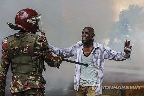 시위대원에 진압봉을 들이대는케냐 경찰관 |