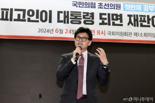 [서울=뉴시스] 조성우 기자 = 국민의힘 당 대표 경선 출마를 선언한 한동훈 전 비상대책위원장이 24일 오전 서울 여의도 국회 의원회관에서 열린 국민의힘 초선의원 공부모임에서 인사말을 하고 있다. 2024.06.24. xconfind@newsis.com /사진=조성우 |