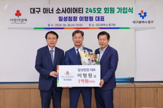대구사회복지공동모금회(회장 김수학)는 26일 대구시 중구청에서 일성침장 이형원 대표가 1억원을 기부약정하며 대구 245번째 아너 소사이어티 회원에 이름을 올렸다고 밝혔다.