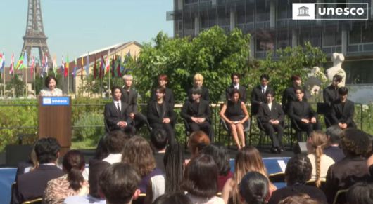 26일 오전(현지시간) 프랑스 파리 유네스코 본부에서는 세븐틴의 유네스코 청년 친선대사 임명식이 진행됐다. 이 자리에서 세븐틴은 오드레 아줄레 유네스코 본부 사무총장으로부터 임명장을 수여받고 10분간 수락 연설을 진행했다.