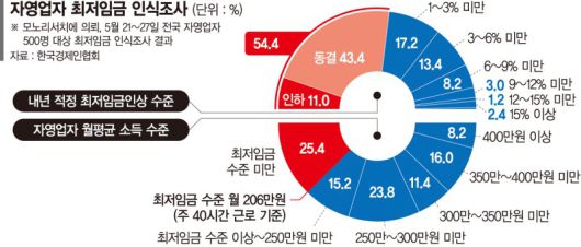 우리나라 자영업자 절반 이상은 내년 최저임금을 동결 또는 인하해야 한다는 반응이 나왔다.