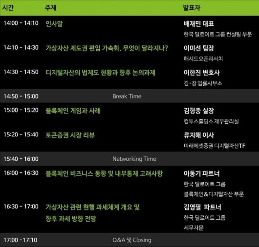 네 번째 세션에서는 류지해 미래에셋증권 디지털자산TF 이사가 토큰증권(ST) 시장 분석을 진행한다. 다섯 번째 세션에서는 한국 딜로이트 그룹 블록체인&디지털자산 부문 이동기 파트너가 ‘블록체인 비즈니스 동향 및 내부통제 고려사항’을 주제로 발표하고, 마지막으로 한국 딜로이트 그룹 세무자문 김영필 파트너가 ‘가상자산 관련 현행 과세체계 개요 및 향후 과세 방향 전망’을 공유한다.