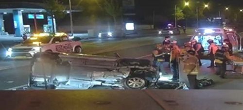 스파크 차량이 포르쉐 차량과 충돌해 전복된 사고 현장. 사진 전북자치도소방본부 |