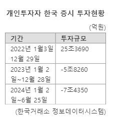 28일 한국거래소 정보데이터시스템에 따르면 2024년 1월 2일부터 6월 25일까지 개인투자자는 한국 증시에서 7조4350억원을 순매도했다. 기관은 11조6090억원을 순매도했다. 연기금 등은 1조1300억원을 순매도했다. 반면 외국인은 22조1570억원을 순매수했다. 2023년 1월 2일부터 12월 28일까지 개인투자자는 5조8260억원을 순매도했다. 기관은 4조2870억원을 순매도했다. 연기금 등은 2조8880억원을 순매도했다. 개인투자자의 K증시 순매도는 2024년의 6개월도 안된 시점에서 2023년 순매도를 훌쩍 뛰어넘었다. 개인투자자의 K증시 엑소더스(탈출)이 가속화되고 있다고 볼 수 있는 부분이다.