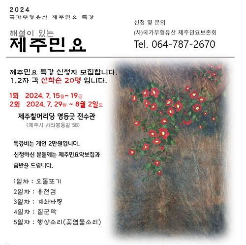 (제주=연합뉴스) (사)국가무형무산 제주민요보존회는 7월 1∼12일 2024년 국가무형유산 일반인 대상 교육 프로그램 민요 특강 참가자를 모집한다.
