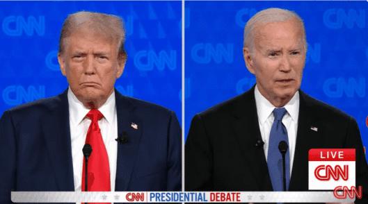 27일 미국 조지아주 애틀랜타 CNN 스튜디오에서 열린 미국 대통령 선거 토론회에서 조 바이든(오른쪽) 대통령이 하려는 말이 생각나지 않아 말을 멈추자 도널드 트럼프 전 대통령이 쳐다보는 모습. /CNN |