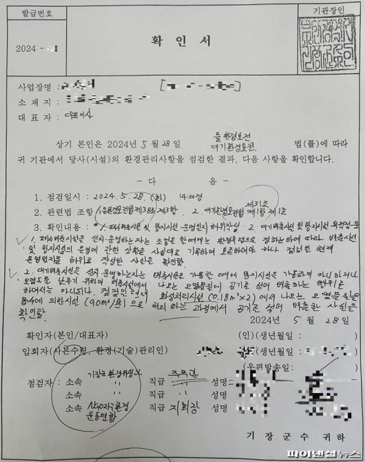 지난달 28일 기장군이 장안읍에 위치한 A사의 사업장을 불시에 찾아 환경관리사항 점검을 진행, ‘물환경보전법’ 및 ‘대기환경보전법’ 위반 사항이 있음을 지적했다. 사진은 기장군이 당일 발급한 관련 확인서. 사진=변옥환 기자, 자료=제보자 제공 |