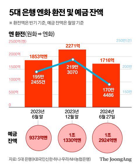 30일 5대 은행(KB국민·신한·하나·우리·NH농협)의 엔화 예금 잔액은 지난 27일 기준 1조2924억엔(11조982억2652만원)으로 지난해 말(1조1330억엔)과 비교해 1594억엔(1조3301억7277만원) 늘었다. 5대 은행의 엔화 예금 잔액은 지난해 6월 말 기준 9373억엔(8조488억7629만원)이었지만, 지난해 말 1조엔을 넘긴 후 최근까지 계속 상승 중이다. 1년 전과 비교하면 이달 27일 기준 엔화 예금 잔액은 약 37.8% 증가했다.