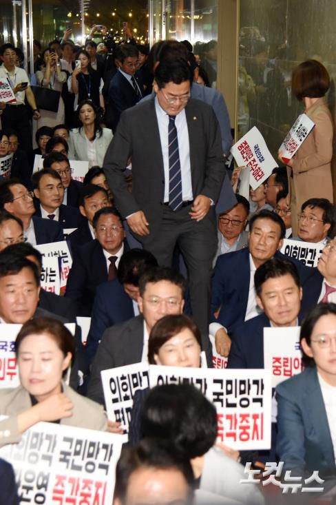 항의하는 국민의힘 의원들을 지나는 민주당 박찬대 원내대표
