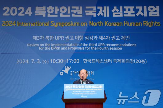 (서울=뉴스1) 박정호 기자 = 송두환 국가인권위원회 위원장이 3일 오전 서울 중구 세종대로 한국프레스센터 국제회의장에서 제3차 북한 UPR 권고 이행 점검과 제4차 권고 제언을 주제로 열린 2024 북한인권 국제 심포지엄에서 개회사를 하고 있다. 2024.7.3/뉴스1