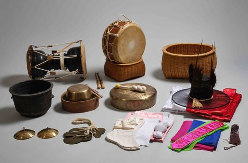 기증자료는 큰 심방이 생전에 직접 사용했던 무복인 홍포 관디(관대), 퀘지(쾌자), 두루마기, 저고리와 바지, 갓 등을 비롯해 무악기(연물)인 북, 설쒜, 대영, 장구 및 바랑, 울쒜 등 33점의 의례용 무구다.