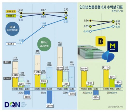 2021년 출범한 토스뱅크의 경우 ROA 마이너스 폭을 좁혀가고 있다. 토스뱅크의 ROA는 2021년 -3.30%에서 2022년 -1.08%로 개선됐고 지난해에는 -0.07%를 나타냈다. 토스뱅크의 순손실은 2021년 -806억원, 2022년 -2644억원, 2023년 -175억원으로 줄었다.