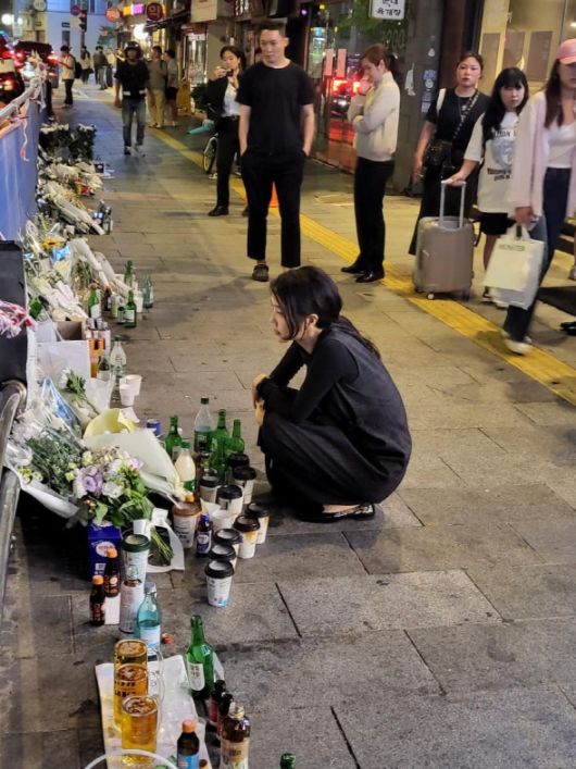 사진에는 검은색 긴 치마를 입은 김 여사가 희생자를 추모하기 위해 시민들이 놓은 국화, 소주병 등이 놓여진 공간 앞에 쪼그려 앉아 한곳을 응시하는 모습이 담겼다.