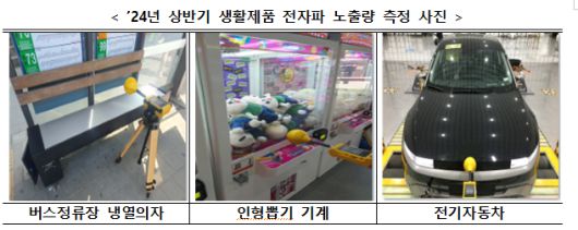 올해 상반기에는 '국민신청제품', '계절(하계)제품', '자체선정제품'으로 구분해 13종, 38개 제품을 선정했다. 국민선정제품은 △버스정류자 냉열 의자 △인이어 모니터 △농구 게임 기계 △자동차 마사지 시트 △화장실 비데 △헤어 드라이기 △인형뽑기 기계 등이다. 계절제품에는 △서큘레이터 △에어컨 및 에어컨 실외기 등이 뽑혔다. 자체선정제품은 △전지자전거 유선 충전설비 △전동킥보드 무선 충전설비 △전기자동차 △전기자동차 유선 충전설비 등을 포함한다. 이들을 국립전파연구원이 전자파 강도 측정 기준에 따라 1개월 동안 측정·분석했다.