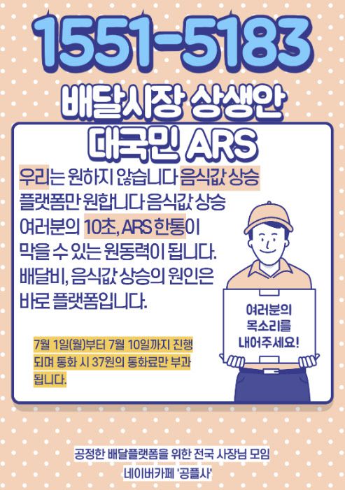 자영업자들을 대상으로 ‘배달시장 상생을 위한 대국민 ARS 동의’도 시행 중이다. 하루 동안 주문을 받지 않는 단체행동 대신 전화로 손쉽게 ARS 동의를 받아 자영업자 의견을 모으는 작업을 오는 10일까지 진행할 계획이다. 공사모 측은 자체 마련한 상생안과 배달시장 정상화에 대한 동의 숫자 등을 국회에 전달할 예정이다.