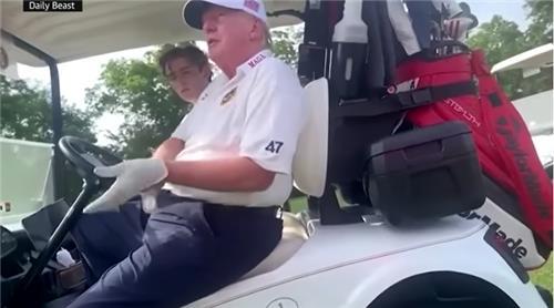 50초 분량의 동영상 속에서 트럼프 전 대통령은 골프 카트의 운전석에 앉아 있었다. 옆좌석에 막내아들 배런을 태운 그는 내기골프를 친 듯 현금을 건네기도 했다.