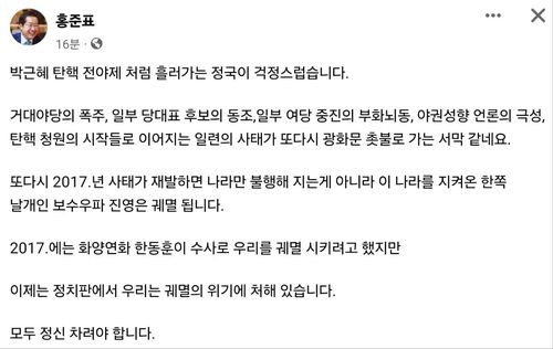 홍 시장은 이날 페이스북 글에서 이같이 말하고 "거대 야당의 폭주, 일부 당 대표 후보의 동조, 일부 여당 중진의 부화뇌동, 야권 성향 언론의 극성, 탄핵 청원의 시작들로 이어지는 일련의 사태가 광화문 촛불로 가는 서막 같다"고 했다.
