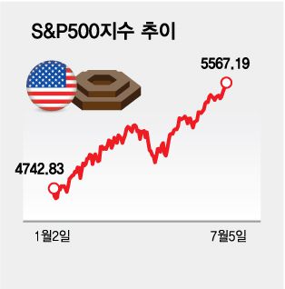 S&P 500 지수는 지난 5일 5567.19로 마감하며 사상 최고치를 기록을 갈아치웠다. 올해 상승분만 16.7%다. 다우존스지수와 나스닥지수 등 세 지수가 모두 주간 상승세를 기록했고, 나스닥은 5주 연속 상승세를 보인다.