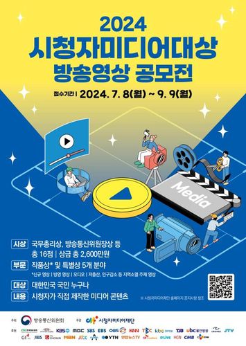 (서울=연합뉴스) 이정현 기자 = 방송통신위원회와 시청자미디어재단은 8일부터 9월 9일까지 '2024 시청자미디어대상 방송영상 공모전' 후보작을 접수한다고 밝혔다.