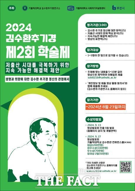 ‘2024년 김수환 추기경 제2회 학술제’는 김수환 추기경 선종 15주년을 맞아 가톨릭대학교에서 주최하는 기념사업이다. 이번 학술제는 생명과 희망에 대한 김수환 추기경의 인간존엄 정신을 바탕으로 저출산시대를 극복하기 위한 시민들의 제안 영상을 공모하는 방식으로 진행된다.
