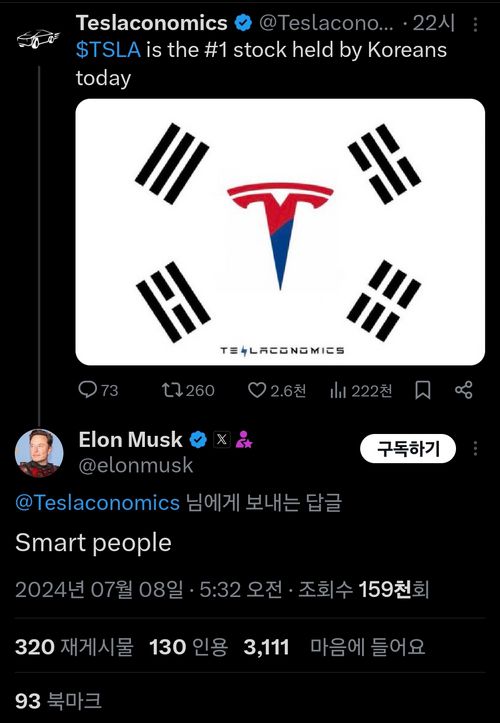 8일 테슬라 관련 소식을 전하는 X계정 ‘테슬라코노믹스’가 ‘테슬라가 한국인이 가장 많이 보유한 주식이다’라는 글과 함께 태극기에 테슬라 로고를 합성한 이미지를 올렸는데 이 글에 일론 머스크 본인이 직접 답글을 남겼다.