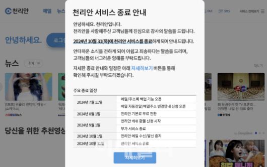 이후 다음 달 1일 천리안 기본료를 무료로 전환하고, 9월 1일에는 문자메시지(SMS), 뉴스(동영상), 인물·운세 등의 부가 서비스를 종료할 예정이다. 천리안 캐시 환불 신청도 9월 1일부터 이뤄진다. 10월 1일부터 천리안 메일 수·발신을 중지하고 31일에 서비스를 완전히 종료한다.