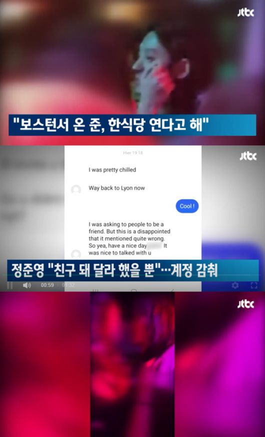 이어 JTBC가 제보자로부터 단독 입수해 보도한 내용에선 정준영이 DM을 통해 자신을 "보스턴에서 온 준"이라고 소개하는 내용이 담겼다. 또한 정준영은 자신을 작가사 겸 작곡가로 소개, "리옹에서 한식당을 열겠다" 등의 발언을 했다.